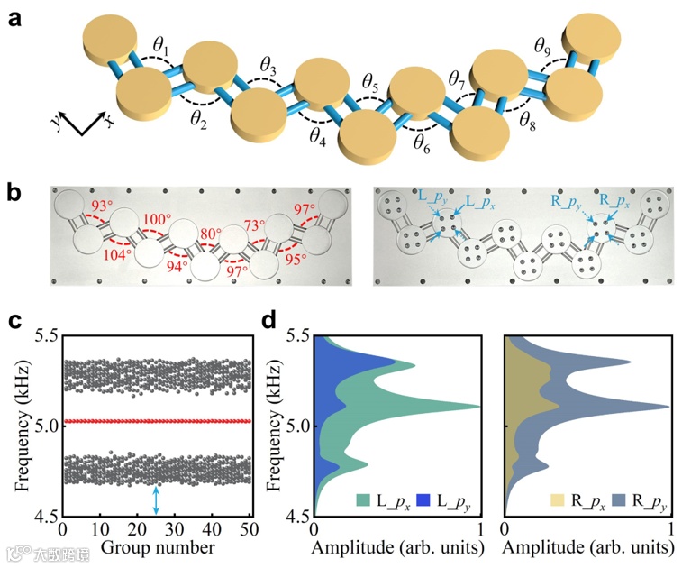 进一步地,研究团队研究了轨道依赖的边界态的拓扑保护性。他们设计了图4a所示的具备[70°,110°]范围内随机选取的无序键合角的谐振腔链,并计算了50组随机情况的能谱(图4c),证明了边界态对键合角无序的鲁棒性。通过制备的一个具有无序键合角的非周期样品(图4b),实验测得不同轨道源激励下的压力幅值响应(图4d),轨道边界态依然保持在带隙中对应频率,阐明其拓扑鲁棒性。