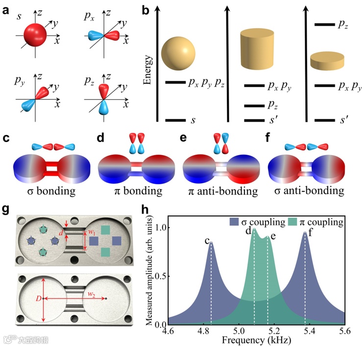 图1.声二聚体谐振腔单元的轨道相互作用。a不同轨道的示意图。b三个不同外形的声学谐振腔及其相关的离散能级。c-f数值计算的二聚体单元的四种不同本征模态的示意图和声压力场分布。g样品图,星号和方框分别表示轨道模式激发和测量的位置。h不同轨道源激励下测量的透射频谱。