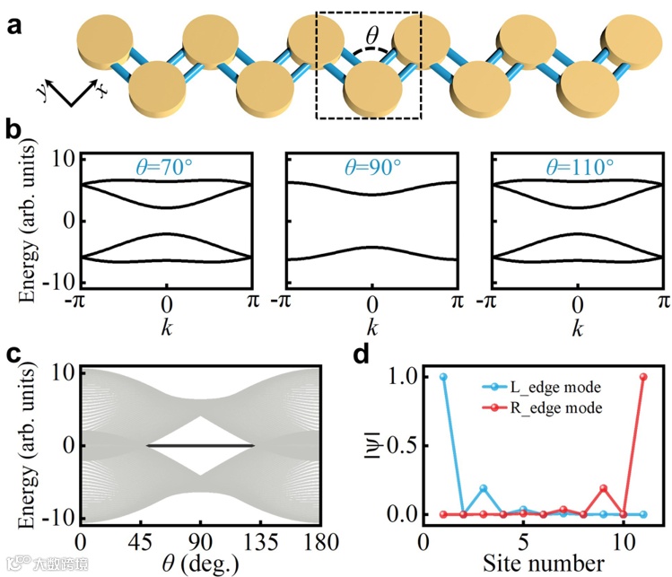图2.可诱导拓扑边界态的轨道SSH模型。a轨道SSH模型。b不同键合角度下的周期性原胞的能带结构。c有限阵列的能谱,中心区域的黑色粗线代表存在的拓扑轨道边界态。d θc=90°时的边界模式。