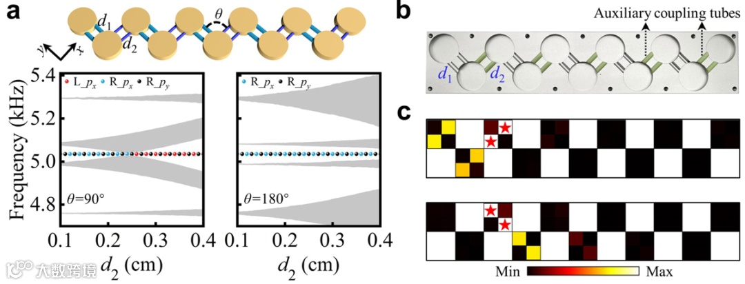 更重要的是,为了可视化轨道SSH模型中的拓扑相变,研究团队通过改变耦合波导管的直径以进一步二聚化轨道耦合幅度(图5a)。直观上,在最左边和最右边的谐振器,用不同的耦合管(d2<d1=0.6cm)来分别强耦合和弱耦合到谐振腔链。与传统SSH模型中产生的保持在最右腔体上的边界态不同的是,在该轨道SSH链出现拓扑相变。在键合角θ=90°时,d2在0.1cm ~ 0.4cm内变化,px模式边界态展现出了从右端隧穿到左端的新颖现象,相变点出现在d2=0.25cm处,这种相变在θ=180°时对应的传统方案中无法同样获得(图5a)。研究者们通过3D打印的辅助管,把图3a 中具备统一耦合波导的样品改装成图 5b中波导不再一致的样品(d2 = 0.4cm)。并在实验上测得了反直觉轨道边界态(图5c)。