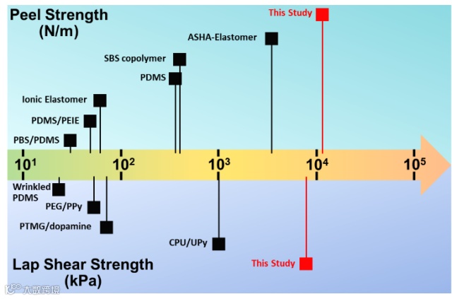 图5. 目前报道的先进延展性粘合剂弹性体的粘合性能总结
