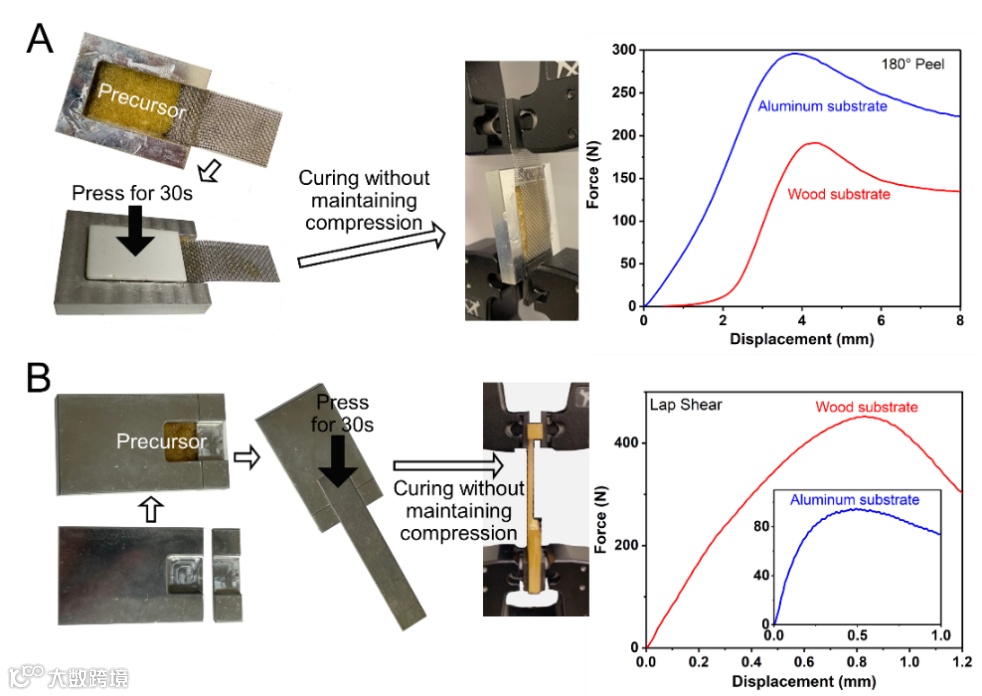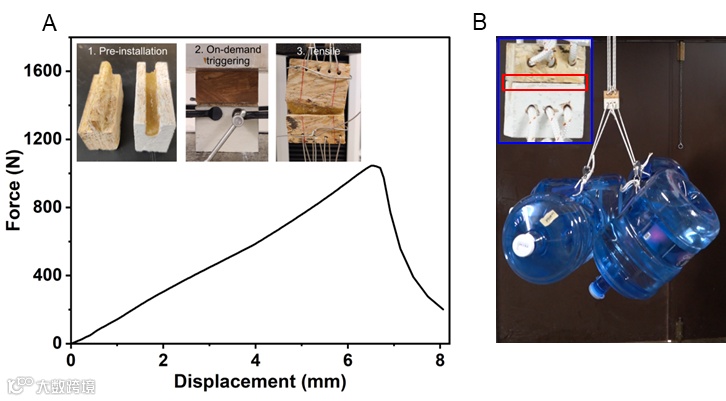 已知的研究以及商业产品技术手册已经充分阐述了湿气或光触发很容易受到环境湿度或光的干扰。而机械力触发既不易受环境条件干扰又易于用户操作。但同样机械力触发的压敏胶与粘合弹性体有着本质的不同。前者不发生化学变化产生粘附,而是通过粘弹特征的变化粘附在表面。此外,压敏胶的厚度限制了其在粗糙表面上的表现。相反,粘合弹性体的力触发策略涉及了化学固化过程,其大幅度提高了粘附所需的内聚力。此外,前驱体可以实现不同的厚度以及柔软性并有助于适应各种表面条件。团队使用了符合ASTM C794和C961标准的测试方法来研究粘合弹性体的粘附力(图4 A和B)。在室温下固化后,铝和木材基材的剥离强度(拉伸速率为50 mm/min)分别为1.2×104 N/m和7.5×10^3 N/m。铝和木材基材的搭接剪切强度(拉伸速率为12.7 mm/min)分别为2.1×103和7.8×103 kPa。该结果超过了已知的先进粘合弹性体材料(图5)。这种超高的粘附力可以解释为以下两个原因。首先,弹性模量比常规橡胶高至少10倍,提供了增强的内聚力。其次,前驱体在安装时呈现类液态的状态,允许其很好地接触并润湿界面。这种按需粘接的特性对于预制件施工具有很大的潜力,因为前驱体可以在触发固化之前非常容易地预装在模块接头上,从而有效地降低劳动力和能源成本,并减轻运输和安装过程中的损坏。为了证明潜在的应用价值,团队将前驱体安装在一种预制沟槽接头(图6A),其固化后的弹性体可以承受4桶水的重量,大约80公斤(图6B)。