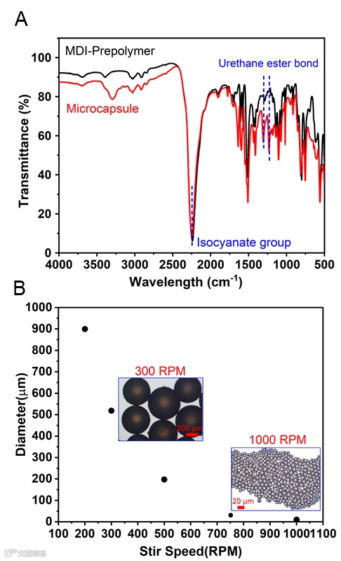 基于对固化速率,弹性体机械性能以及可扩大生产的考虑,团队采用了二苯基甲烷二异氰酸酯预聚物(MDI-prepolymer),和聚丙二醇二胺(PPG-diamine)以及甲基丙烯酸甲酯-丙烯酸丁酯-丙烯酸乙基己酯无规共聚物聚(Poly MMA-r-BA-r-EHA)作为前驱体, 并对MDI-prepolymer进行了微囊封装以实现可外力触发的粘附功能(图1)。FT-IR和DSC表征了微囊壳层的化学特征结构以及微囊内部仍具反应活性的MDI-prepolymer(图2A)。微囊尺寸可通过改变分散聚合法的搅拌速度和反应时间来进行控制,在200-1000 RPM 之间,团队获得了10-900 微米不等的微囊(图2B)。这种可控的尺寸将影响1)破坏微胶囊并引发固化反应所需的力 以及2)释放的反应剂在聚合物基质中的分散。基于对不同压力下微囊的破裂状态和固化所得的粘附力进行筛选,在300 RPM下合成的微囊需要500 N的压缩力(作用于10cm2模具)。团队观察到,在500 N下,剥离强度显著增加(500%)。而在200-RPM下合成的微囊只需要较小的触发力(150 N)却展现相对较差的粘附性能。另一方面,Poly MMA-r-BA-r-EHA,作为聚合物基体,提高了弹性体在力触发固化之前的界面粘附性能以及使用寿命。