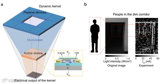 图 (a) 局域关联感内计算原理示意图以及器件结构示意图;(b) 一种典型场景下弱目标特征提取的实验结果。