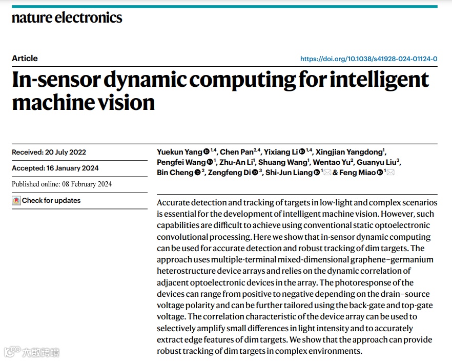 机器在雨雾天“看不见”怎么办?面对在低对比度视觉环境下识别目标的挑战,南京大学物理学院梁世军副教授和缪峰教授领导的团队创新提出了“传感器内动态计算”概念。通过在基于新型材料结构的传感器内集成更多计算与信息处理功能,该技术能够在对比度变化的环境中始终保持对目标的精准识别和高鲁棒追踪。该工作推动了智能机器视觉技术的发展,有望在多个领域内实现其革新应用。