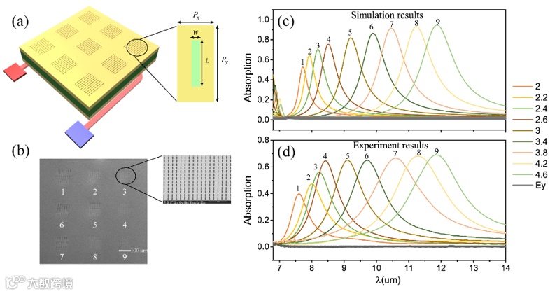 该团队设计并实现了一个由像素化超构微腔阵列组成的热辐射芯片,其辐射波长可以覆盖7.8-12 μm。超构微腔阵列由3×3纳米孔超构表面阵列和FP腔组成,通过连续调控纳米孔尺寸,可以获得连续红移的吸收与辐射峰(图1)。
