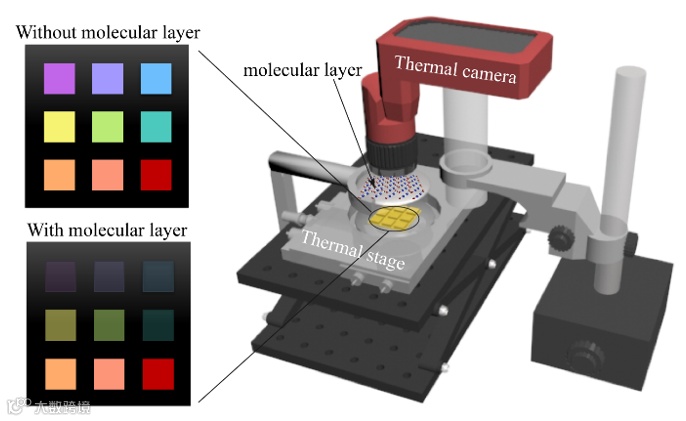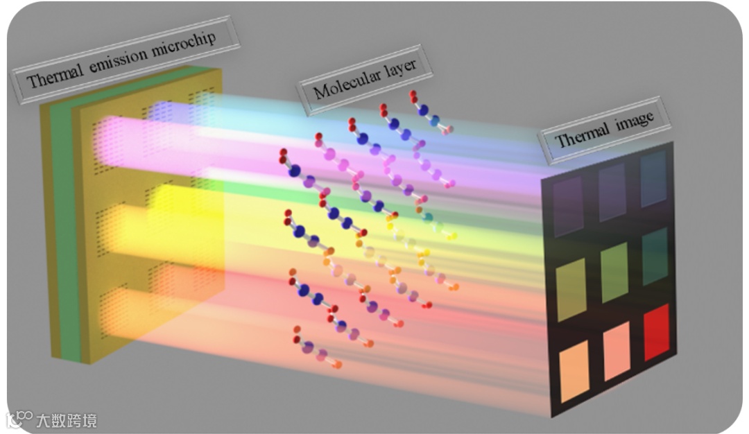 超构微腔阵列的热辐射信号透过待测有机分子层后,由热像仪探测到并展示为带有有机分子吸收光谱信息的热像图。
