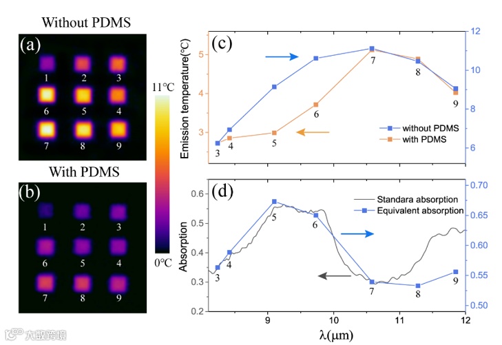 图3. 有无PDMS分子层时拍摄所得热像图以及热探测所得的PDMS等效红外吸收光谱;