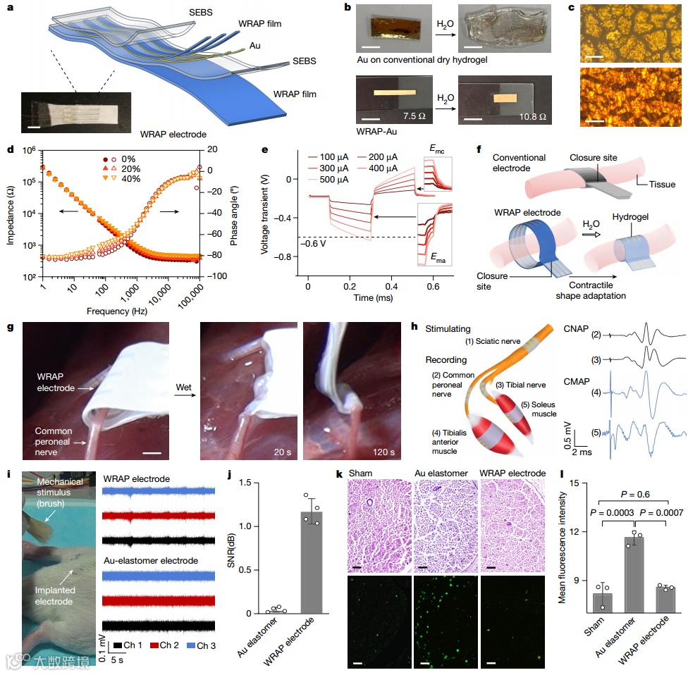 作者使用WRAP薄膜制造了用于周围神经刺激和电生理信号记录的WRAP电极阵列,具有小的电化学阻抗、可拉伸性、更高的电荷注入能力和稳定性。