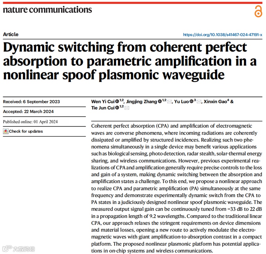 近日,东南大学的崔铁军院士、张婧婧教授课题组与南京航空航天大学罗宇教授课题组合作,提出了一种从非线性相干完美吸收至参量放大的动态调控方法,并在人工表面等离激元的平台上进行了验证。相关成果以“Dynamic switching from coherent perfect absorption to parametric amplification in a nonlinear spoof plasmonic waveguide”为题发表于Nature Communications (2024) 15:2824。传统的线性相干完美吸收方法是基于透射和反射光的干涉效应,因此需要器件的尺寸与材料的折射率满足特定的关系。本文提出的非线性方法通过引入差频信号提供额外的调控自由度,可适用于任意尺寸和材料的器件,仅通过改变输入的泵浦波与信号波间的相位关系即可实现对信号波输出功率的灵活调制。东南大学的博士研究生崔文怡为本文的第一作者,张婧婧教授、罗宇教授、崔铁军院士为共同通讯作者,香港城市大学的博士后高欣欣也参与了该工作。