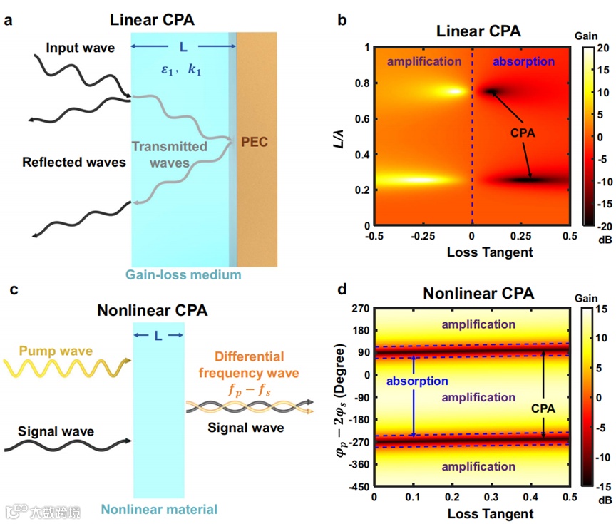 图1|线性和非线性相干完美吸收原理。a线性相干完美吸收器的示意图。在第一和第二个界面反射的波之间的相消干涉导致吸收增强。b 线性系统的随介质厚度L和损耗正切变化的信号波增益/吸收。CPA只能在吸收材料的损耗正切与厚度为特定值时实现。c 非线性相干完美吸收器的示意图。通过控制输入的泵浦波与信号波之间的相位关系,可以将信号波与三波混频产生的差频波之间的干涉关系由相长干涉调节为相消干涉,从而实现参量放大和相干完美吸收。d非线性系统的随输入的泵浦和信号波间的相位差