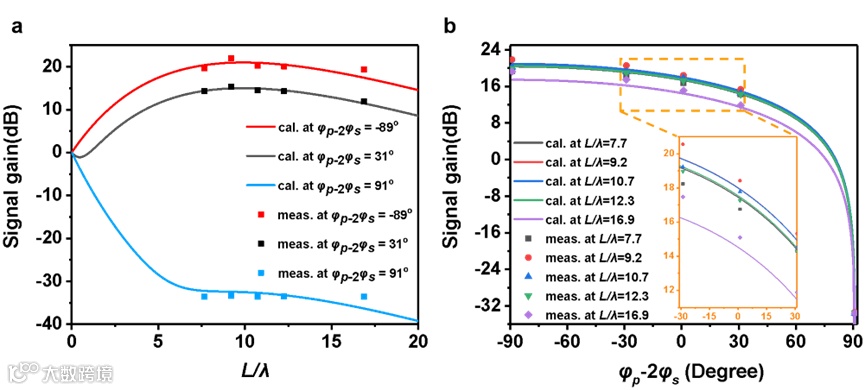 图3 |计算和测量的非线性人工表面等离极化激元波导的信号波增益。a 信号波增益在不同输入波间相位差下随传输距离的变化曲线。b信号波增益在不同传输距离下随输入波间相位差的变化线。