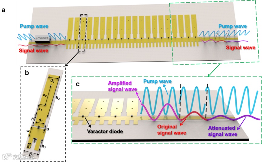 图2|非线性人工表面等离极化激元波导,用于对信号波从进行相干完美吸收到简并参量放大的动态切换。a 非线性SSPP波导示意图。b SSPP波导的单元结构。c 输出端口处的示意图。