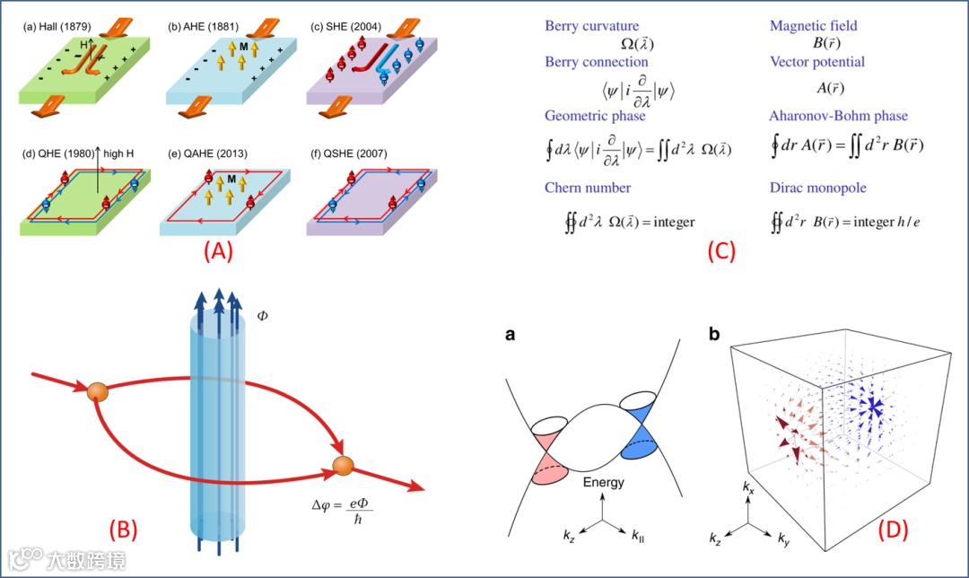 图 2. (A) 霍尔效应家族。(B) 在 k 空间中的贝里相位物理,与在实空间中的电磁学之间,存在某种对应关系。(C) 连接实空间电磁学和 k 空间量子力学之最简单图像:AB 效应。(D) 拓扑半金属的能带结构 (tilted Dirac cones) 和对应的贝里曲率分布。
