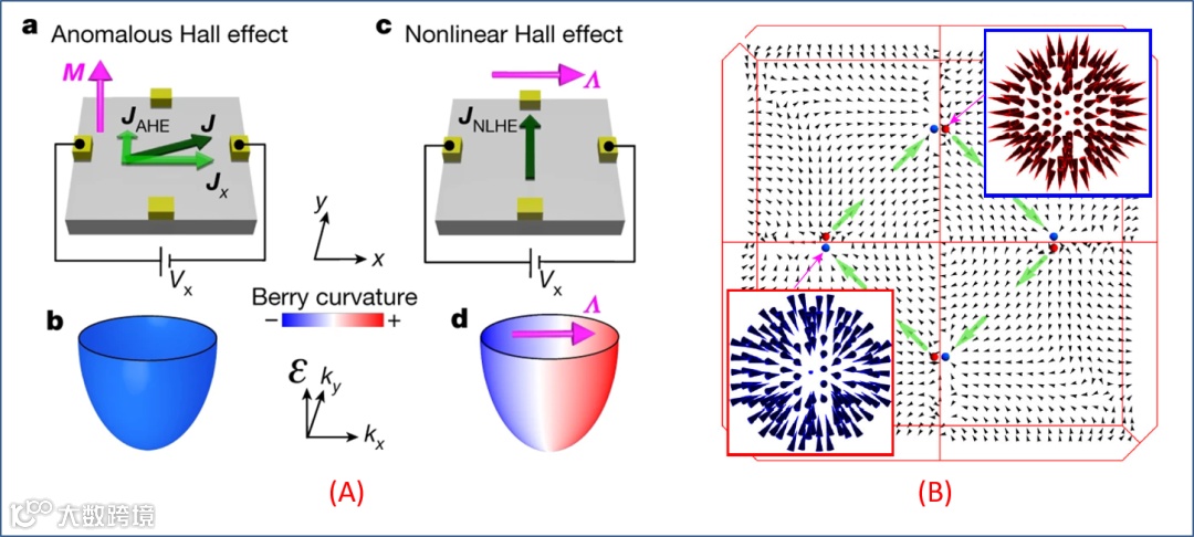 图 3. (A) 反常霍尔效应 (a) 对应于贝里曲率 (b);非线性霍尔效应 (c)对应于贝里曲率一阶矩 (d) (颜色不同对应于贝里曲率的变化,形成 dipole 偶极矩 Λ)。(B) 在非磁性、中心反演对称破缺的化合物 TaAs 中,贝里曲率的分布和对应的磁单极子形态。