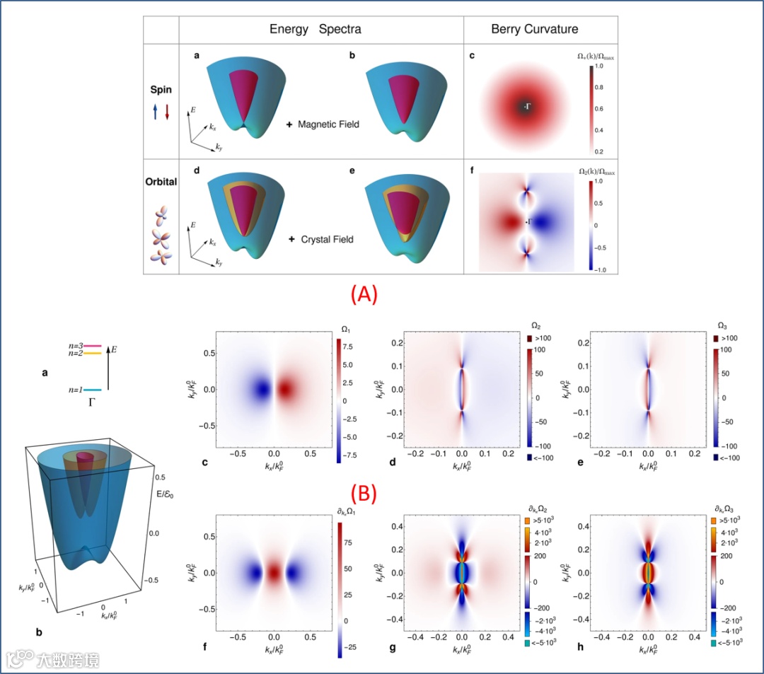 图 4. 由晶体场诱导的轨道角动量可以调控贝里曲率:(A) Spin and orbital mechanisms of Berry curvature。(B) Orbital design of Berry curvature hot-spots and pinch points。