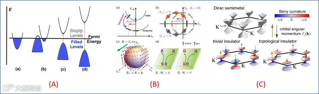图 1. 物理人擅长描绘的 k 空间能带结构之几个例子。(A) 固体电子态最简单直观的表达,包括金属 (a)、半金属 (b)、半导体 (c) 和绝缘体 (d)。(B) 在 k 空间中,电子自旋和轨道自由度相关物理的一种展现,包括自旋 - 轨道耦合 SOC、轨道霍尔效应 OHE (orbital Hall effect) 等。(C) 在 k 空间中,狄拉克和拓扑量子体系的贝里曲率,其中狄拉克锥 (Dirac cone) 处贝里曲率用颜色表示、轨道角动量用箭头表示。图示细节内容,请参阅相关文献 (链接地址)。