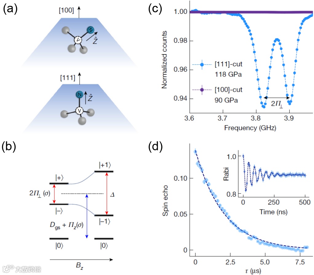 图二:百万大气压力条件下NV色心的量子传感。(a)沿[100]和[111]面切割的金刚石中NV色心的原子分布示意图,(b)压力、应力以及磁场条件下电子基态能级结构的变化,(c)高压下不同方向色心对应的光探测磁共振谱线强度对比,(d)137 GPa条件下Sample S2的自旋回波和拉比振荡。
