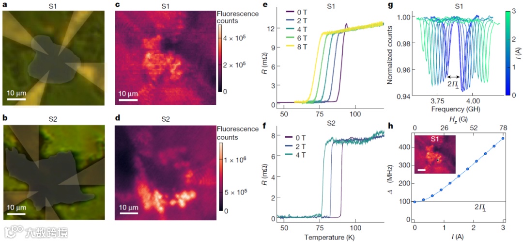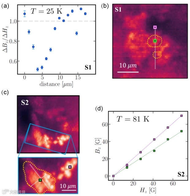 图五:外磁场中CeH9超导样品的空间分布。(a)外磁场中Sample S1的抗磁性沿线性方向的分布,(b) Sample S1的荧光成像照片,(c)Sample S2的荧光成像照片,(d) Sample S2特定位置磁感应强度随外磁场的变化。