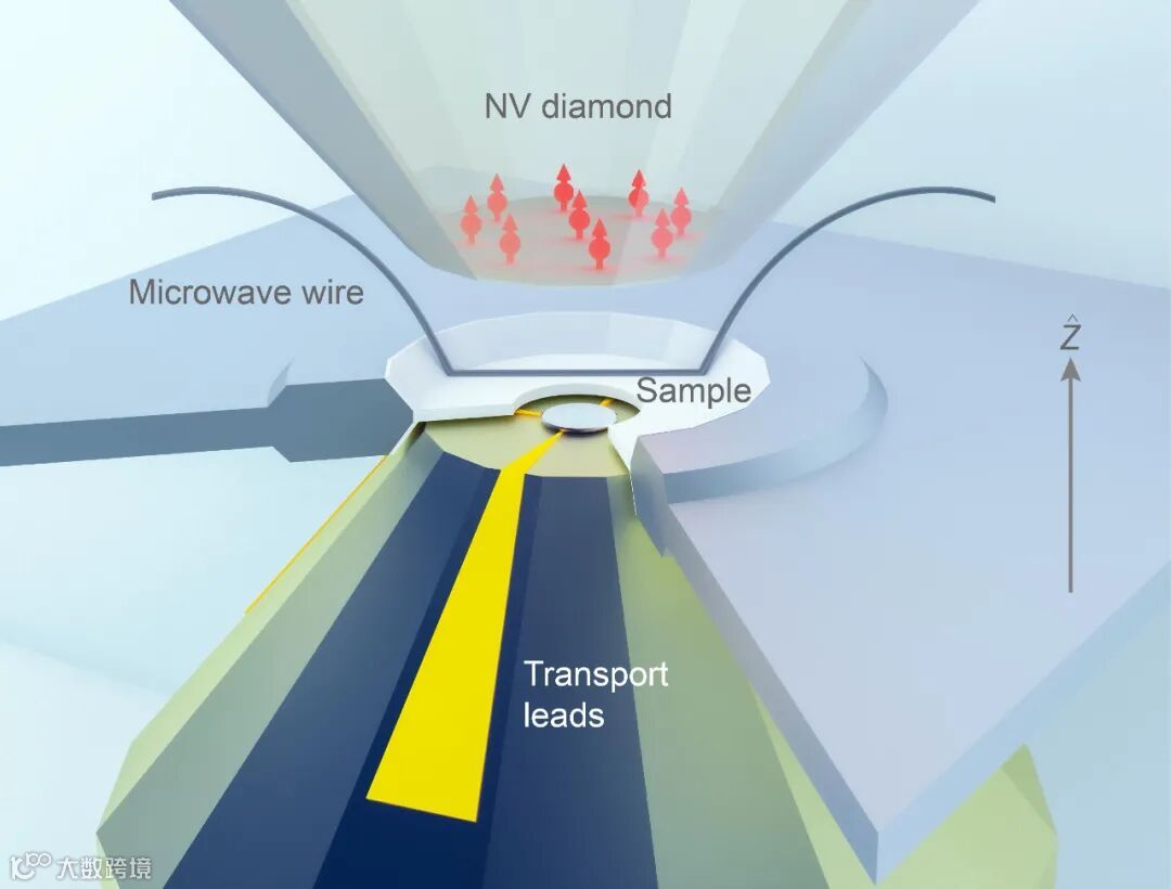 图一:匹配NV色心磁测量技术及电输运测量的金刚石对顶砧装置示意图,实现了富氢化合物超导样品在同一压力条件下零电阻和迈斯纳效应的协同测量。