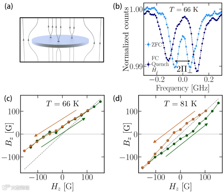 研究团队对磁通钉扎效应也进行了更细致的研究。实验首先测量了在从零场冷却到Tc以下,ODMR共振谱线因非静水压性产生的劈裂。然而将样品在外磁场中冷却到相同温度再退去外磁场后,实验却观察到了更大程度的劈裂。这正是由于样品在场冷过程中俘获的磁通导致的。进一步,实验还测量了样品在场冷到不同温度时的磁滞回线。这表明钉扎的磁通在更低温度下具有更高的强度,符合第二类超导体的特征。