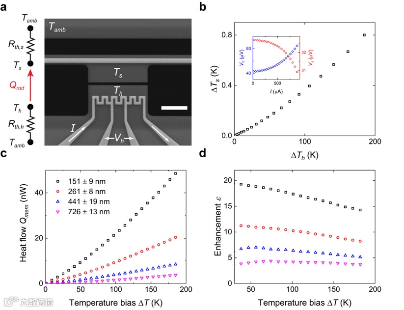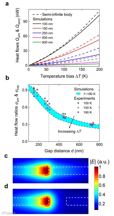 图 2. 测量设置和实验结果。利用焦耳热加热发射膜并通过测量四线电压Vh来检测发射膜温度Th,吸收的辐射热流Q通过热传导散失到硅基底中,相应吸收膜的温度Ts由惠斯通电桥电压Vs监控。吸收端细长的梁状结构,使得吸收端的热阻Rth,s易于标定。由于换热面积极小,发射膜近200K的温升仅在吸收膜产生1K左右的温升,如图2b所示。我们测量了薄膜间距在150nm至750nm之间的不同样品,随着间距从726nm下降到153nm,最大热流从约4nW增加到约50nW,相应的关于黑体的最大增益,由约4倍增加至约20倍。