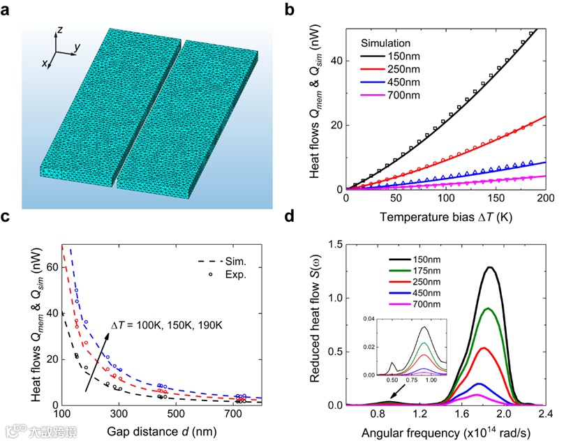 图 3. 波动电磁仿真与测量结果验证。我们采用波动表面电流法(Fluctuating surface current method)来计算两片共面氮化硅薄膜(长宽高7 µm × 2 µm × 300 nm)之间的近场热辐射,相应几何和网格如图3a所示。在190K的温差范围和150nm至750nm的间距范围,总计12个样品的测试结果,均和仿真结果符合地很好。图3d所示为,发生在氮化硅共振频率附近的极化声子激元(角频率约为1.8×1014 rad/s)贡献了大部分的近场热辐射。