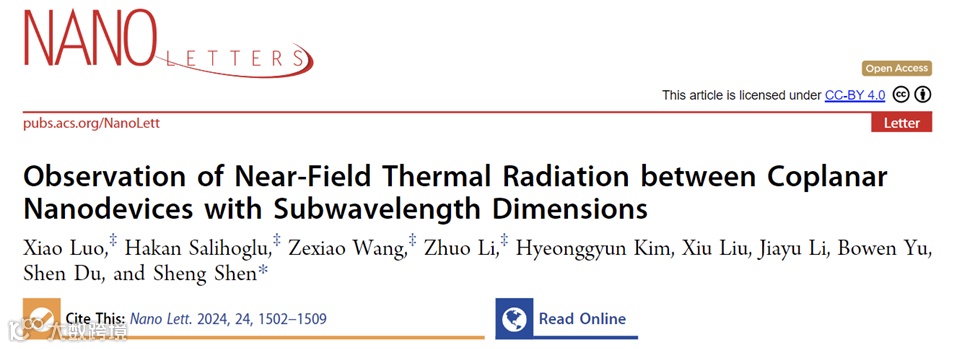 Xiao Luo, Hakan Salihoglu, Zexiao Wang, Zhuo Li, Hyeonggyun Kim, Xiu Liu, Jiayu Li, Bowen Yu,Shen Du, and Sheng Shen, Observation of Near-Field Thermal Radiation between Coplanar Nanodevices with Subwavelength Dimensions, Nano Letters (2024).