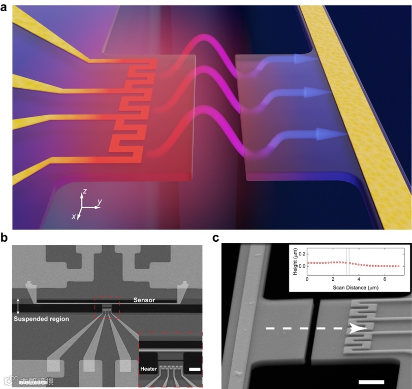 图1. 悬挂纳米器件示意图(a)与实物电镜照片(b, c)。突出的发射膜(左侧)通过铂金蛇形加热器加热,突出的吸收膜(右侧)吸收热辐射并升温,两侧温度均由铂金电阻温度计监测。为了物理隔离发射膜和吸收膜,从而消除任何热传导的贡献,我们通过湿法刻蚀去除下方的硅基底,制成悬挂结构。通过优化工艺流程,在保证硅基底刻穿的同时,悬挂区域的宽度(y方向)仅为约15 μm,从而遏制了薄膜的形变。图1c所示为70度倾角的电镜照片,两片薄膜有很好的共面性,高度差仅为约50nm。