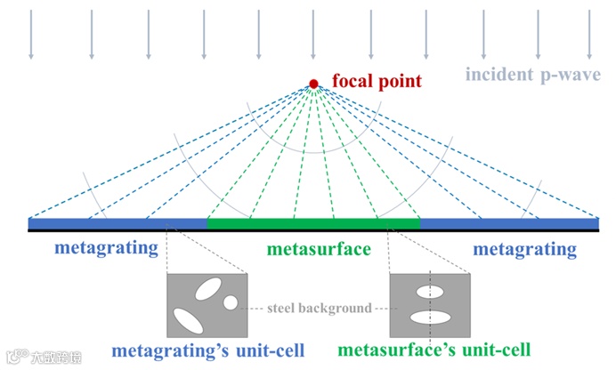 图1. 中心为超表面、两端为超格栅的复合型弹性波超透镜,能够将正入射的纵波聚焦到某一点上,并同时抑制反射横波的产生。其中,超格栅原胞为在钢基体上刻凿2个椭圆柱和1个圆柱而构成,超表面原胞为在钢基体上刻凿2个水平居中、上下排列的椭圆柱而构成。