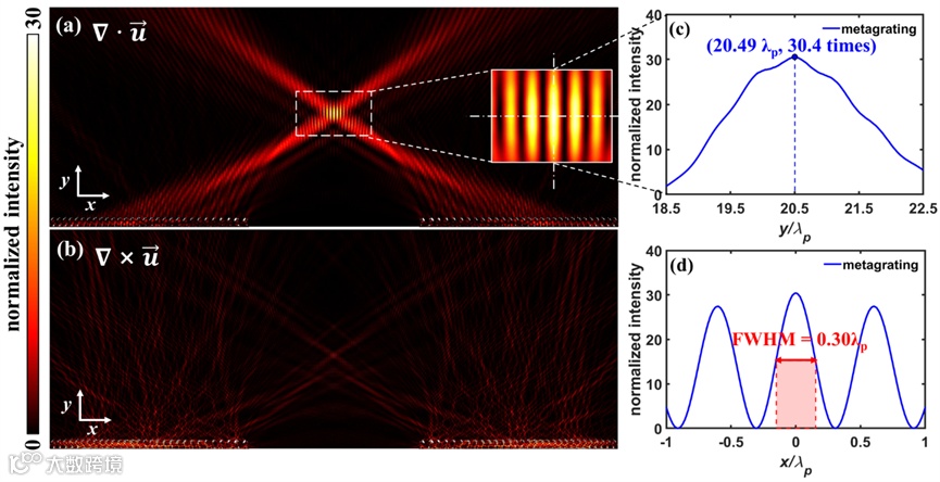图4.基于超格栅的弹性波超透镜。(a)反射纵波的归一化位移场强度。(b)反射横波的归一化位移场强度。(c)沿透镜主轴的纵向归一化场强分布。(d)在焦平面上的横向归一化场强分布。