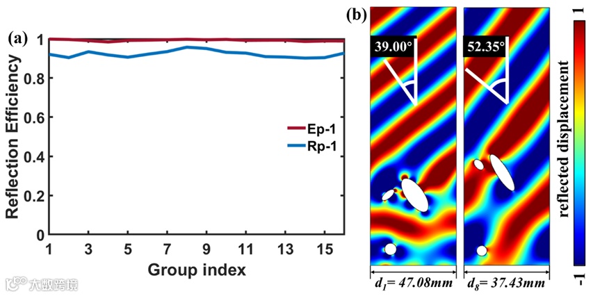 代表-1阶反射纵波在总反射能量中的占比。(b)超格栅的第1及第8个原胞的反射波位移场。