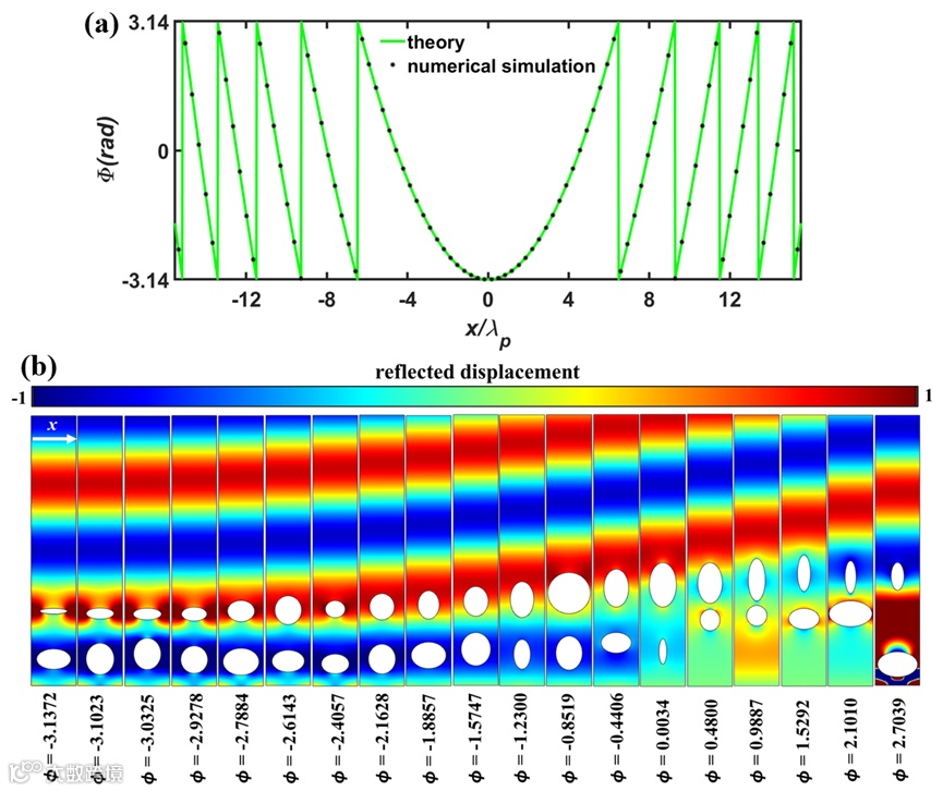 时的超表面相位分布函数及离散化结果。(b)前19个超表面原胞的反射波位移场,横跨2π相移。