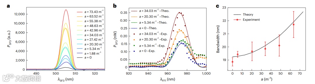 图4: 具有不同加速度的弯曲加速波导CAW中,宽带和频产生SFG的实验演示。