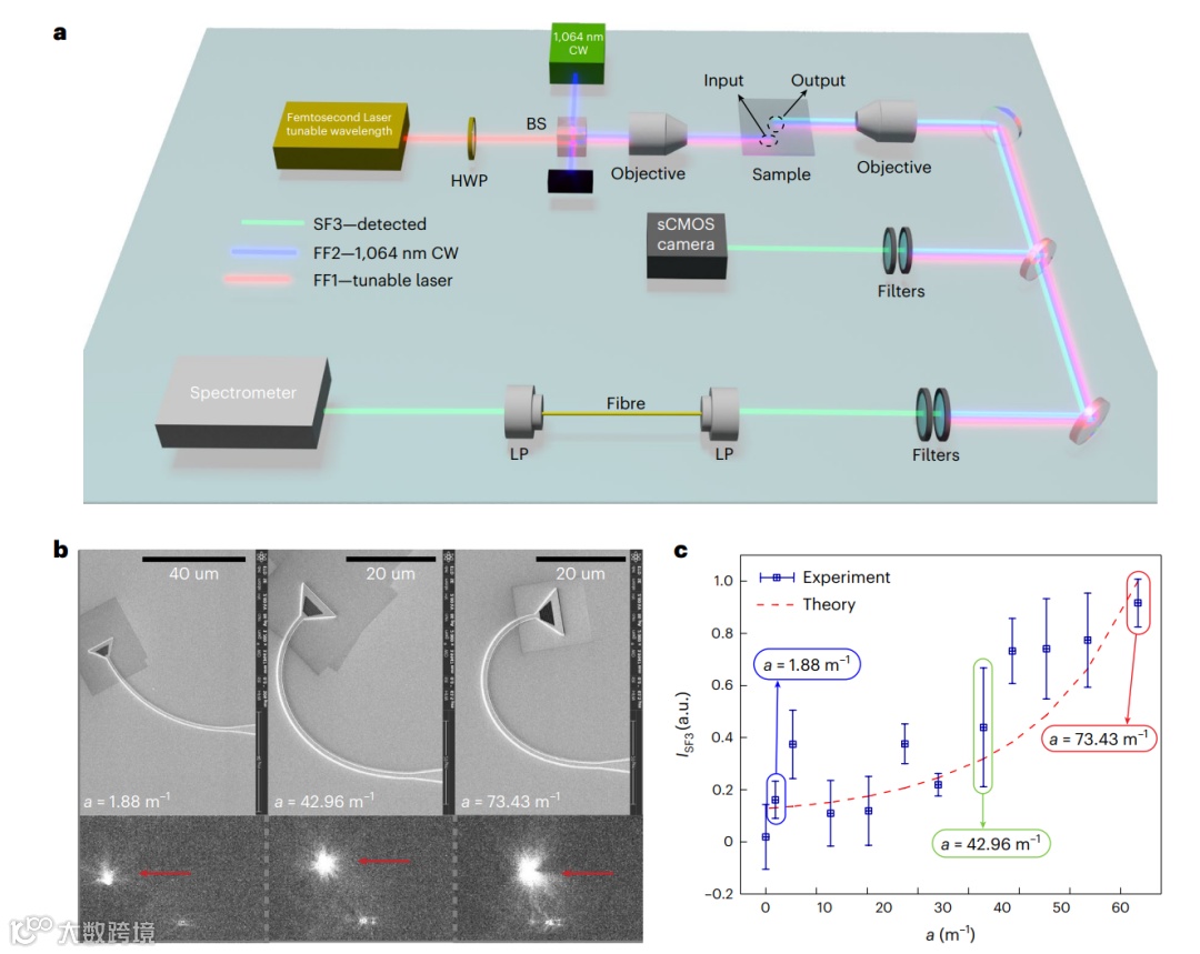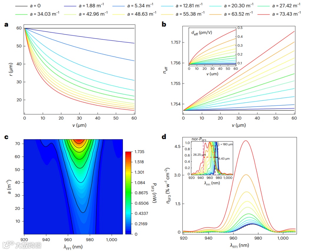 通过严格的解析计算,研究发现了在非线性过程中,增加加速度(即波导曲率的梯度)会使输出信号频谱变宽。在实验中,以和频产生红外信号上转换为例,利用绝缘体上铌酸锂薄膜,制作了各种弯曲的加速波导。在宽带连续频谱上,观察到了有效的和频产生。