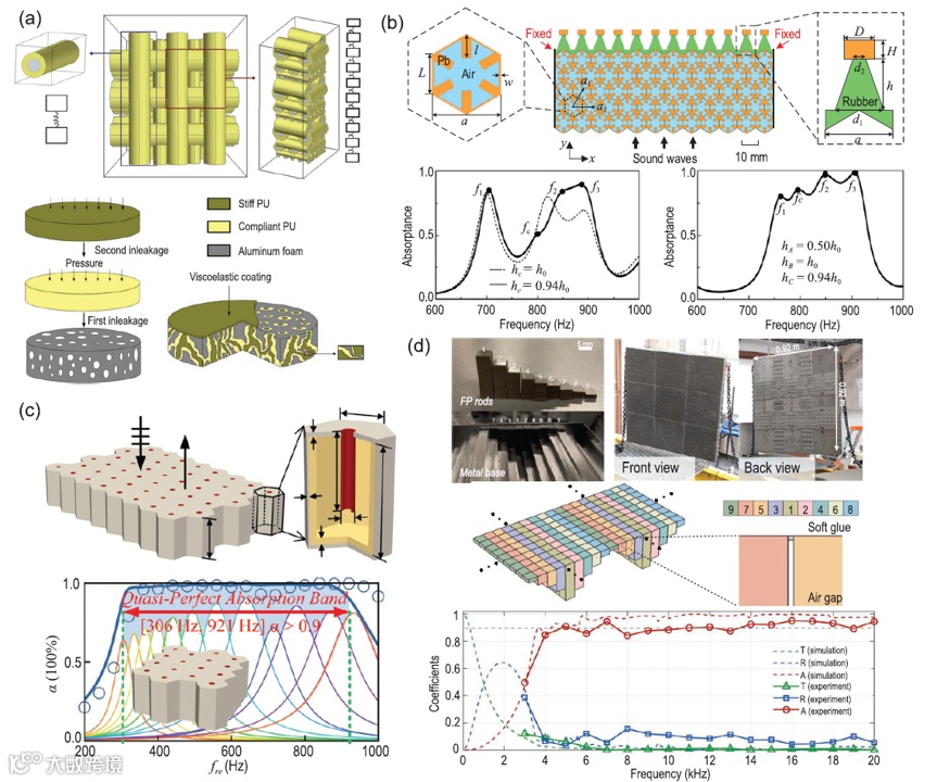 (a)局域共振声子木桩(LRPW)的模型简化过程;三个顺序堆叠尺寸的软PU涂层钢木桩层的透视图;(b)基于RMR背衬PM的复合材料超表面吸收器的示意图;(c)所研究超材料的几何形状;(d) 集成Fabry-Pérot(FP)谐振器阵列显示周期性重复