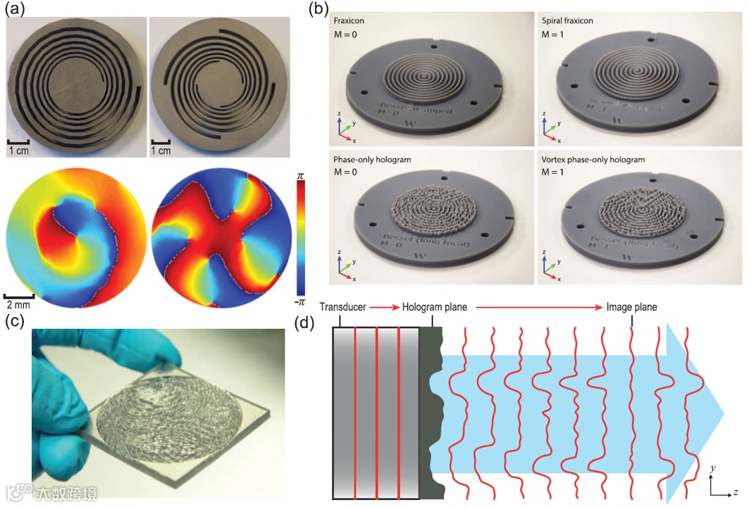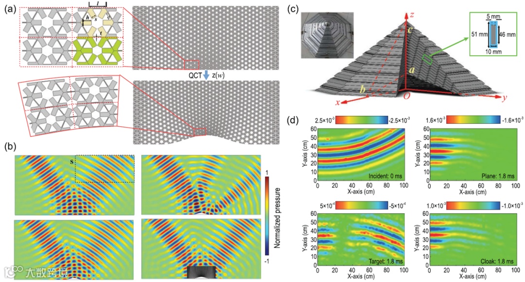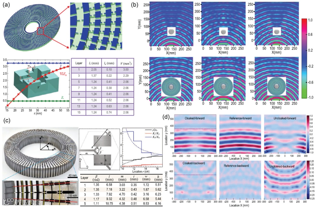 (a)圆柱形声隐身结构(并联电容器和串联电感器),由声音传输线合成;(b)使用超声波点源照射的隐蔽和裸露钢制圆筒的压力场测量图;(c)五模超材料设计的固体声学斗篷的详细照片和材料参数;(d)测量的声压场包括隐蔽、未隐蔽和参考案例下的后向散射和前向传递压力