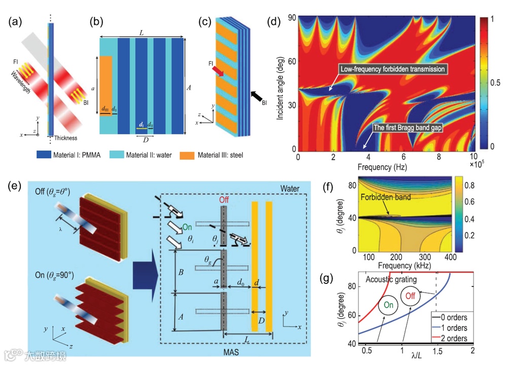(a)亚波长非对称声传输(SAAT)设备示意图;(b)单胞示意图;(c)3D多层结构描述;(d)多层SAAT的传输系数随入射角和频率的变化;(e)MAS结构的系统描述;(f) 传输系数随入射角和频率的变化,其中N=2;(g)归一化波长λ/L与衍射角的相关性