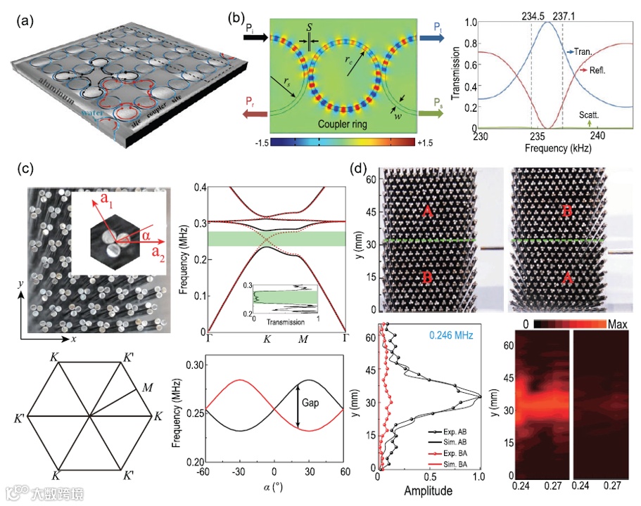 (a)方形晶格示意图,包括嵌入铝背景中的水环;(b)站点环和耦合器环的配置;(c)描绘了由三角形晶格阵列中的超分子制成的浸水声子晶体;