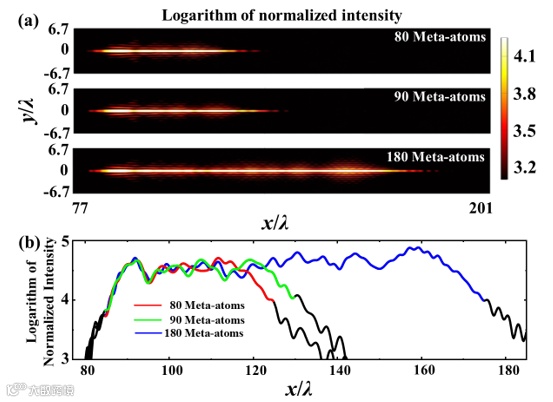 图3. 三个超透镜的聚焦效应,分别含有80、90和180个超原子。a) 在xy平面内的对数压强分布。b) 沿纵向x轴的压强分布曲线。