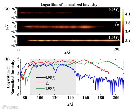 图4. 超透镜在不同频率下的聚焦性能。a) 在3个不同频率下xy平面内的对数压强分布。b) 沿纵向x轴的压强分布曲线。