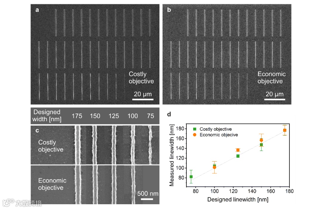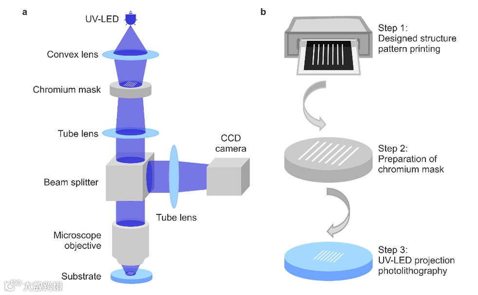 为了能够更方便地制备加工所需的模板,研究人员也开发了一套涵盖了从结构设计及打印,铬掩模版制备到MPP加工光学器件的完整工序(示意图如图1b所示)。