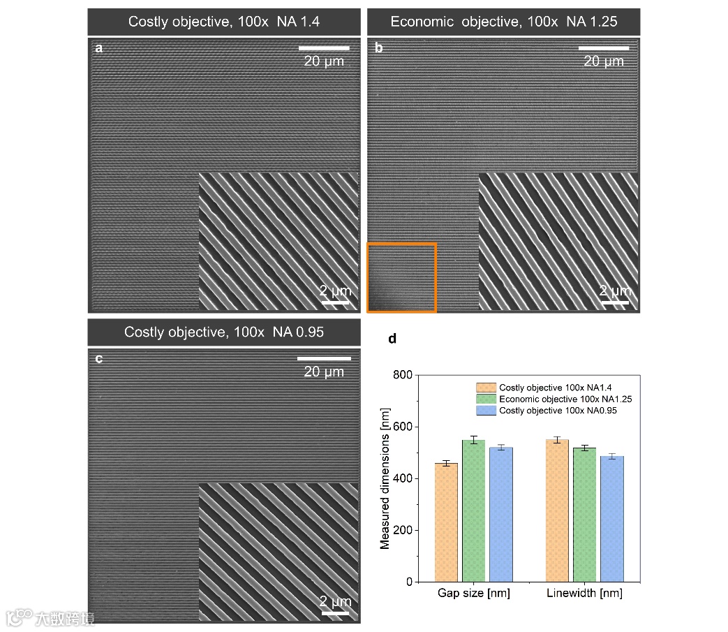 图3:不同厂商,不同NA值的显微物镜加工光栅结构