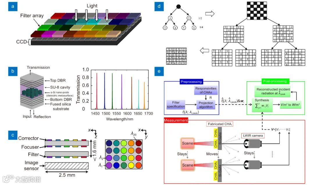 图2 基于透射型超构表面的光谱成像。(a)集成滤波阵列组成的紧凑型光谱仪;(b)具有不同纳米柱宽度的一组滤波器模拟透射光谱;(c)超构表面快照光谱成像仪的示意图;(d)多光谱拼接滤波器生成过程示意图;(e)未知源入射功率的目标检测策略框图
