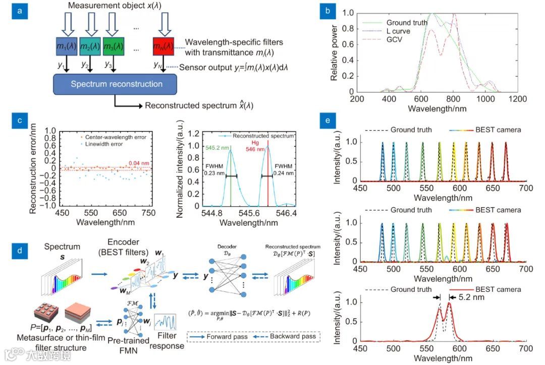 图3 光谱重建算法。(a)光谱重建系统示意图;(b)宽带光谱的重建结果:(c)基于CS理论的窄带光谱重建结果;(d)参数约束光谱编码器和解码器的设计框架;(e)基于深度学习的重建结果