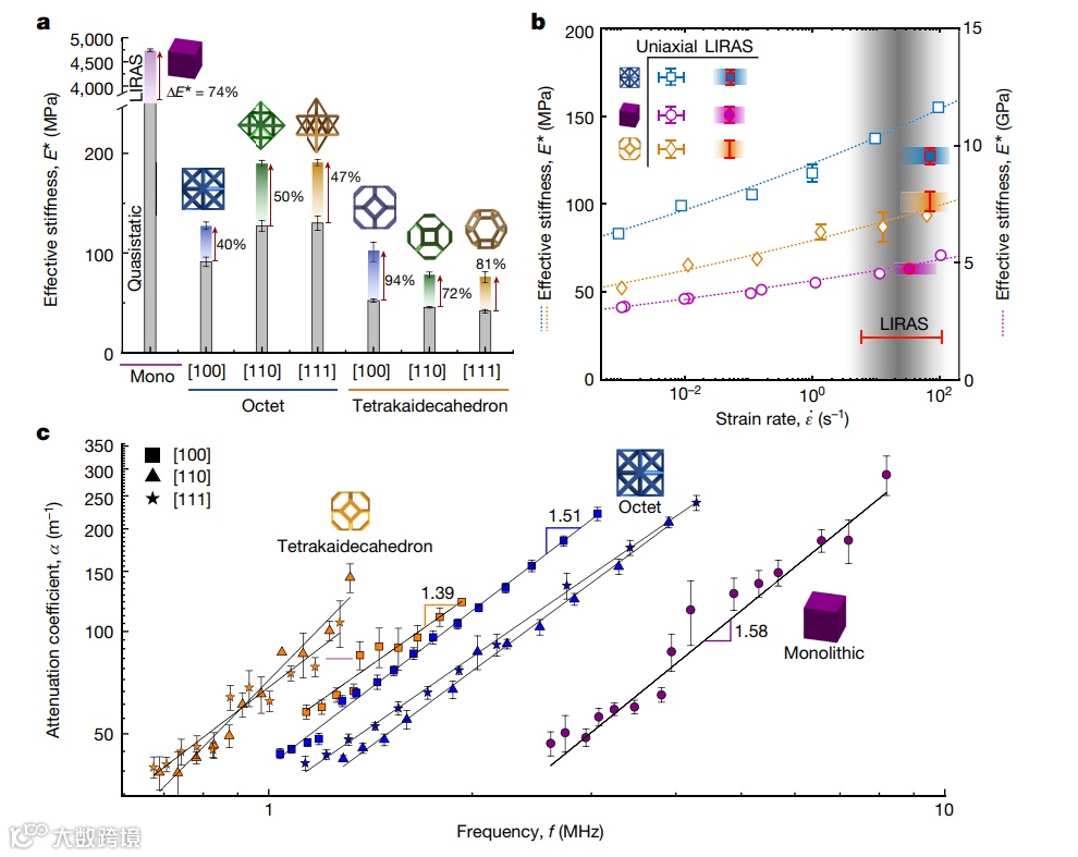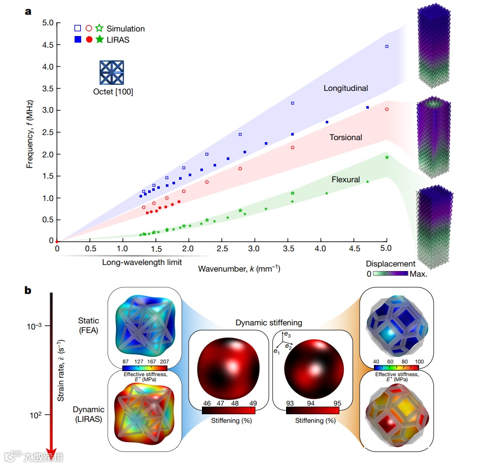 基于微观力学超材料的棒状晶胞平铺tessellations,在接近10e2s-1应变率时,实现了高达94%方向相关和速率相关的动态硬化,以及比其组成材料高三倍的阻尼性能。