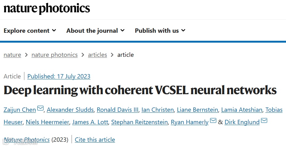 该成果发表在Nature Photonics,题为“Deep Learning with Coherent VCSEL Neural Networks”。麻省理工学院的陈在俊博士(现为南加州大学电子工程系助理教授)为论文的第一作者兼通讯作者,Dr Ryan Hamerly (NTT) 和Dirk Englund教授为共同通讯作者。