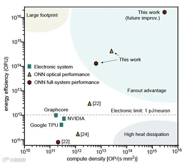 近日,麻省理工光学AI团队实现了从器件到芯片架构的全新设计。用激光阵列模拟细胞神经网络,开发了一种全新的光芯片架构,实现了整体性能突破。第一次实现光学计算芯片对电子计算的优势,提升了100倍的能量效率和20倍的计算密度,并有望在近期内实现多个数量级的提升。