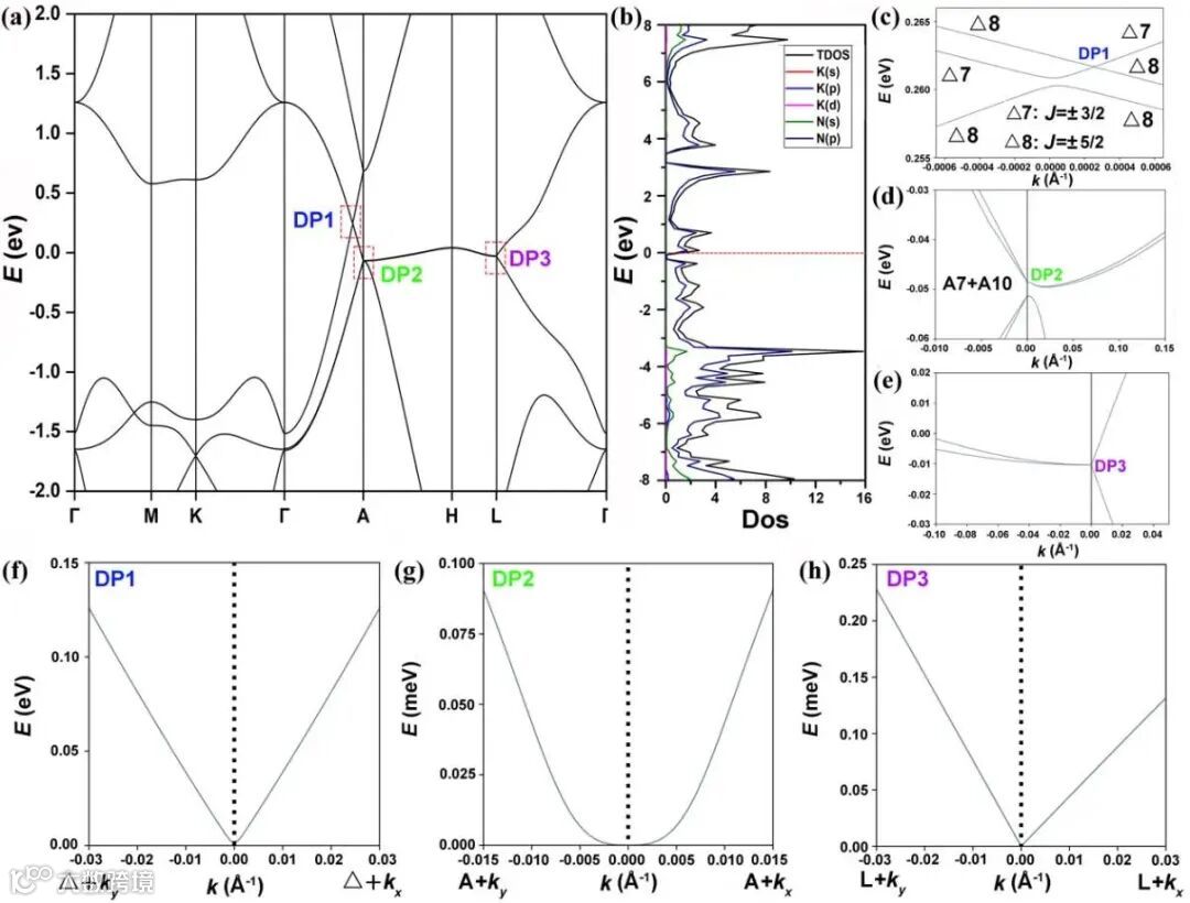 K2N16的能带结构呈现拓扑半金属特性,同时存在线性及立方电子色散的狄拉克点(图2),成为了高阶色散狄拉克费米子材料家族的第三类新成员,是研究量子临界性、连续量子相变和色散依赖的量子输运等新奇的物理效应的理想材料平台。