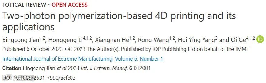 Jian B C, Li H G, He X N, Wang R, Yang H Y, Ge Q. 2024. Two-photon polymerization-based 4D printing and its applications. Int. J. Extrem. Manuf. 6 012001.